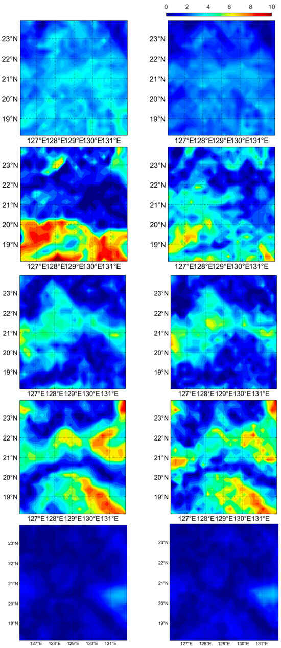 To further illustrate the reconstruction effects of the RF-SDR model on the three-dimensional acoustic speed field, this study utilized satellite remote sensing data of the sea surface (SLA, SST, ADT) from 1 July 2024 to reconstruct the acoustic speed field in the study area. The spatial distribution of the sound speed reconstruction errors was analyzed using reanalysis products from the Copernicus Marine Service (CMEMS) (https://marine.copernicus.eu, accessed on 26 January 2025). The results are illustrated in Figure 7, with the left column representing the errors of the RF-SR model and the right column representing the errors of the RF-SDR model. The depth layers, from top to bottom, are 10 m, 95 m, 202 m, 499 m, and 978 m.