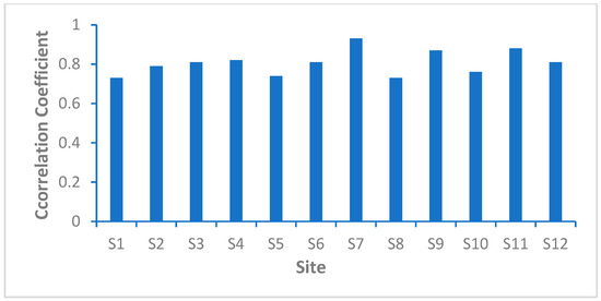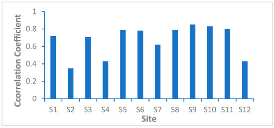 The correlation coefficients for the acoustic propagation losses at 12 stations based on RF-SDR SSP and Argo SSP (with both source and receiver depths set at 50 m).