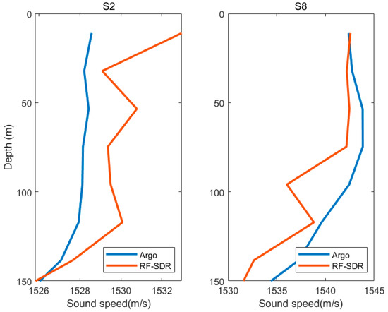 The SSPs between RF-SDR SSP and Argo SSP for stations S2 and S8, with depths shallower than 150 m.
