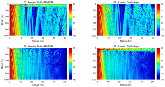 The propagation loss graphs: (a) sound field based on RF-SDR SSP at station S2; (b) sound field based on Argo SSP at station S2; (c) sound field based on RF-SDR SSP at station S8; (d) sound field based on Argo SSP at station S8.