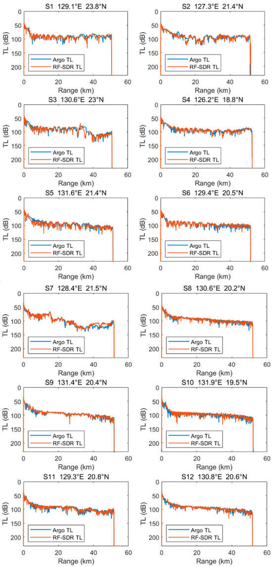 Upon increasing the source and receiver depths to 150 m, as illustrated in Figure 12, the acoustic propagation losses derived from both SSPs across 12 stations exhibited a high degree of consistency and yielded an average correlation coefficient of 0.80. Figure 13 displays the correlation coefficients for each station. Without the influence of surface waveguide effects, the acoustic propagation losses derived from Argo SSP and RF-SDR SSP showed a strong correlation, suggesting that the reconstructed SSP from the RF-SDR model was effective at acoustic propagation simulations.
