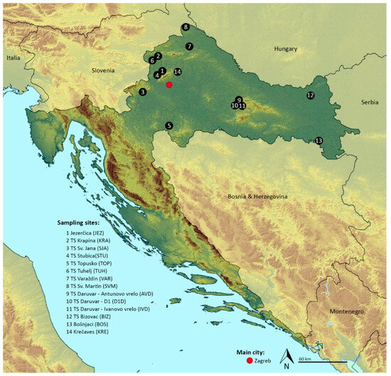 This study included 14 geothermal water sites across northern, central, and Pannonian Croatia (Figure 1). Sites were categorized into 5 groups based on geographical location, hydrochemical conditions, geological characteristics, and hydrogeological properties of aquifers, as described in [17]. In short, Aquifer Group 1 consisted of 7 hydrothermal sites differing in light exposure and temperature. The enclosed geothermal spring catchments without light exposure were Jezerčica (JEZ), TS Krapina (KRA), and TS Stubica (STU), while TS Sv.Jana (SJA), TS Topusko (TOP), TS Tuhelj (TUH), and TS Varaždin (VAR) were light-exposed open basins, differing in temperature: KRA, STU, and VAR are hyperthermal, while TUH is hypothermal. Geologically, VAR consists of alluvial deposits (gravel and sand), whereas the others have carbonate sediments [19]. The enclosed TS Sv. Martin (SVM) spring belongs to Aquifer Group 2. Aquifer Group 3 included TS Daruvar (enclosed lightless Antunovo vrelo (AVD) and Marijino vrelo (D1D), and an open basin Ivanovo vrelo (IVD)), which are typical dolomite/limestone thermal aquifers [19]. The enclosed TS Bizovac (BIZ) and Bošnjaci (BOS) are part of Aquifer Group 4, characterized by gravelly sand and sandy-clayey gravels [20]. The Krečaves (KRE) site does not belong to any of the previously mentioned groups and represents a unique Na-HCO3 aquifer, characterized by silicate minerals and water-rock interactions [21] (Figure 1).