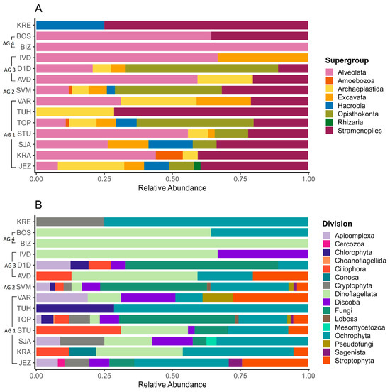 Relative abundance of all eukaryotic communities at the taxonomic level of supergroup (A) and division (B) identified at 14 geothermal sites in Croatia during the autumn of 2020. Taxa are colored by supergroup and division.