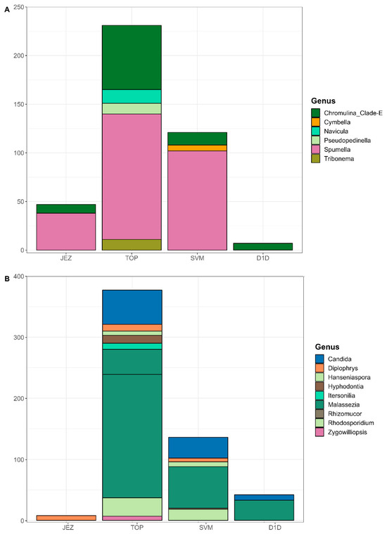 The actual representation of microbial eukaryotes at the taxonomic level of genera at the four geothermal sites in Croatia that displayed the most pronounced quantitative and qualitative composition during the autumn of 2020. The genera associated with the processes of primary production (A) and decomposition (B) were singled out.