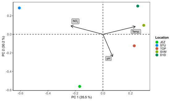 Principal coordinate analysis (PCoA) of microbial eukaryotic community based on Bray–Curtis dissimilarity matrix. Environmental variables that showed a significant influence on the microbial eukaryotic community based on the PERMANOVA test (p < 0.05) are represented by vectors: temperature, pH, and NO3− concentrations. Points are samples colored by five sampling locations that displayed the most pronounced quantitative and qualitative composition during the autumn of 2020.