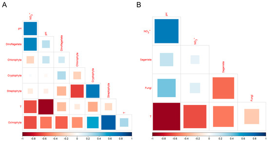 Finally, correlation analysis based on Pearson’s coefficient revealed a positive correlation between Dinoflagellata and nitrates, and a negative correlation between Ochrophyta, nitrates, and pH values (Figure 5A). In addition, correlation analysis showed positive correlations of Streptophyta with Ochrophyta and Cryptophyta, contrary to negative with Chlorophyta. Contrary to previously mentioned primary producers, decomposers Fungi and Sagenista, as well as Sagenista and temperature, correlated negatively, while Fungi and pH correlated positively (Figure 5B). Moreover, a comprehensive examination of the parameters demonstrated a complete negative correlation between temperature and pH (Figure 5A), a strong negative correlation between temperature and nitrates (Figure 5A,B), and a positive correlation between pH values and nitrates (Figure 5B).