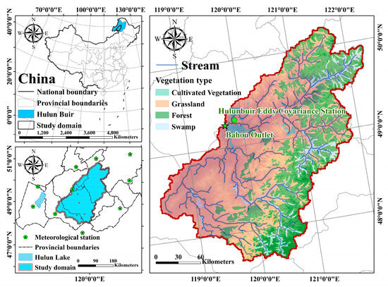 Widespread vegetation changes were observed due to climate change and afforestation during the last several decades across the globe [35,36,37]. Vegetation greening was observed from 1978 even in arid and semi-arid areas in northwest China due to global warming [38,39,40] and coinciding with ecological restoration (e.g., the Three-North Forest Shelterbelt (TNFS) program in northwest China). Generally, the competition between instream and off-stream EWRs in arid and semi-arid areas highlights the increased attention that should be paid to the coupled vegetation and hydrology model or hydro-ecological model. The hydrological-ecological model should consider the interplay between vegetation and hydrological processes. However, hydrological models (such as SWAT, VIC, etc.) take vegetation processes as static parameters and disregard the effect of hydrological elements on vegetation growth. Hence, two-way ecohydrological models are needed in our study. We selected the Hailar River Basin as our study area, aiming to accurately calculate the in- and out-stream EWRs within the context of climate and vegetation change. Our specific objectives were as follows: (1) to establish a two-way ecohydrological model to model runoff and evapotranspiration (ET); (2) to calculate the in- and out-stream EWRs and the vegetation effect; (3) to evaluate the effect of climate change (precipitation and temperature) on in- and out-stream EWRs.