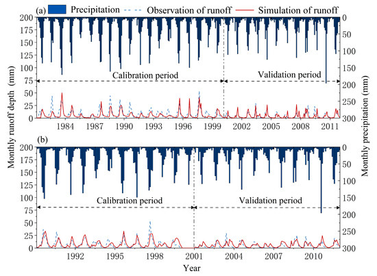 The precipitation, observed and simulated monthly runoff depth for the calibration period (January 1982–December 2000) and for the validation period (January 2001–December 2012) in the Hailar River Basin. (a) RHESSys model; (b) SWAT model.