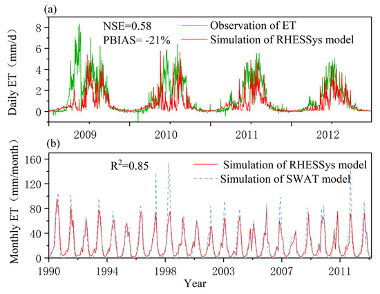 Evaluation of ET: (a) comparison between observed and simulated ET by RHESSys model; (b) comparison between simulated ET by RHESSys model and by SWAT model.