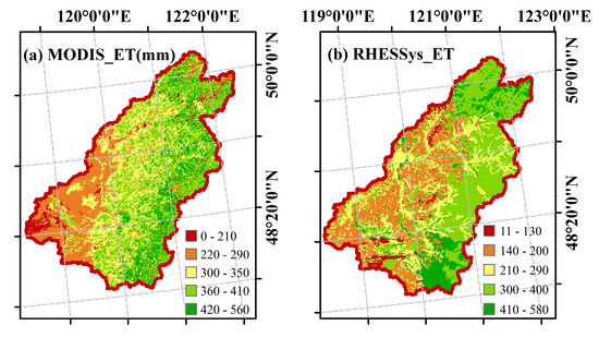 Spatial comparison of ET results from different sources: (a) MODIS; (b) modeling RHESSys.