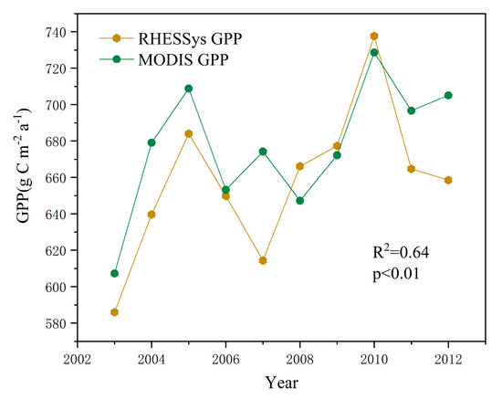 This study focuses only on interannual variation characteristics of GPP (Gross Primary Production). Therefore, MODIS GPP values (8-day, 500 m resolution) from 2003 to 2012 were used to validate the model-simulated GPP values (Figure 5). The comparison results show that the RHESSys model achieved an annual mean GPP correlation coefficient (R2) of 0.64, with p < 0.01. In terms of interannual variation, aside from a lower simulated value in 2007, the model and MODIS GPP values showed minimal differences and a relatively consistent trend, indicating that RHESSys can effectively capture changes in GPP characteristics for vegetation in the middle and upper reaches of the Hailar River basin.