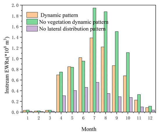 We obtained the calculated multi-year monthly instream EWRs in the Hailar River Basin, along with the instream EWRs under scenarios without vegetation dynamics and without lateral flow redistribution (Figure 6). Between April and October, the instream EWRs are relatively high, with each month contributing over 9% of the total, summing to 94.50% of the annual EWRs. In contrast, the instream EWRs in January, February, and March are exceedingly low, at 8, 9, and 5 million m3, respectively, with a marked decline compared to April to October and lower than in November and December. This seasonal gap highlights the substantial drop in precipitation after the rainy season, resulting in very low average monthly runoff within the channel. Therefore, water allocation strategies in the basin should prioritize the conservation of instream water resources from January to March to maintain ecological balance. Previous studies have shown that the competitive relationship between evapotranspiration and runoff can result in an approximately 20% decrease in runoff [33,50].