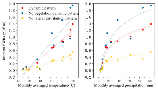 In the scenario without vegetation dynamics, the correlation between temperature and instream EWRs significantly weakens (R2 = 0.79, p < 0.05). This may be due to the lack of vegetation mortality during the non-growing season, as vegetation in this scenario remains unaffected by current climatic and hydrological conditions.