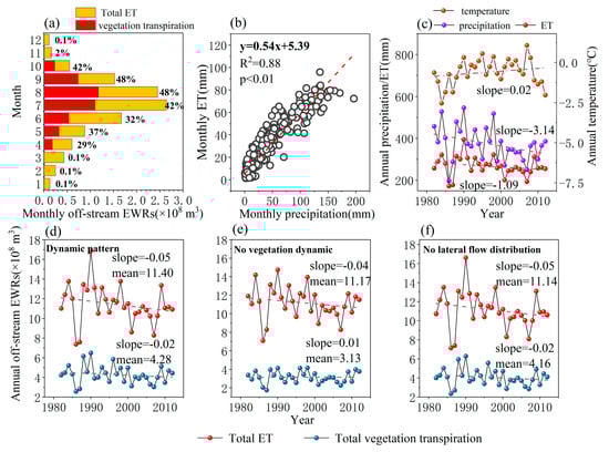 Inter- and intra-variation of off-stream EWRs and their response to monthly temperature and precipitation: (a) monthly contribution ratio of vegetation transpiration; (b) linear correlation between monthly precipitation and evapotranspiration; (c) temporal trends of precipitation, temperature and ET; (d–f) interannual variations of total evapotranspiration and vegetation transpiration under different scenarios.