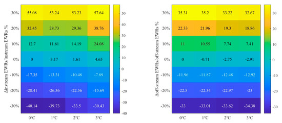 The responses of instream and off-stream EWRs to temperature increase, precipitation changes, and their interactions (Figure 9) indicate that as temperature rises by 1 °C, 2 °C and 3 °C, off-stream EWRs slightly decrease by −0.71%, −2.75% and −2.91%, respectively, with greater reductions as temperature increases. Conversely, instream EWRs show slight increases of 3.17%, 1.60% and 4.65% for the same temperature increments. Although higher temperatures enhance soil evaporation, they inhibit vegetation photosynthesis, leading to a reduction in transpiration efficiency. This reduced water usage in vegetation redistributes some water to the instream EWRs, resulting in a slight increase.