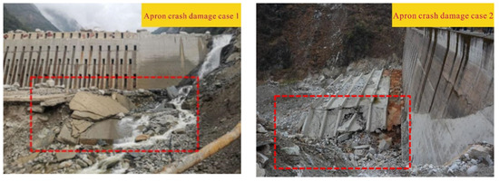 Cases of apron crash damage. (The case occurred in Cutou gully, Wenchuan County, Sichuan Province, China).