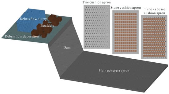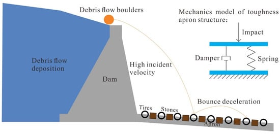 In order to enhance the apron’s ability to resist boulders in debris flows and extend the service life of the apron structure, this paper proposes a tire–stone composite cushion apron structure for a downstream retaining dam. The tire–stone composite cushion layer is embedded in the concrete of the apron structure, as shown in Figure 2.