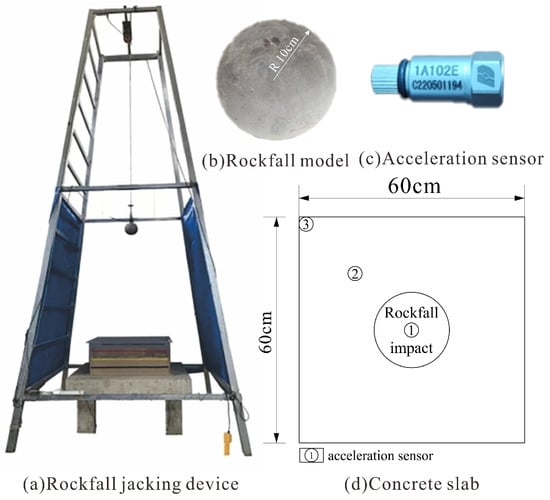 The impact test device comprises three components: a rockfall jacking device, a rockfall model, and a data acquisition device, as shown in Figure 3. The rockfall lifting and lowering apparatus is further divided into a rockfall, a steel truss structure, a winch, and an electromagnetic hook release mechanism. The rockfall material is granite, and the rolling and rotation of the stone are disregarded. The rockfall is modeled as a sphere with a radius of 0.1 m and a density of 2500 kg/m3. The height of the truss is 6.00 m, with the top and bottom face dimensions measuring 1.15 m and 2.50 m, respectively. The rockfall can be raised and released using the winch and electromagnetic hook release mechanism, and its fixed height can be controlled to enable the rockfall to freely fall and impact the center of the concrete plate.