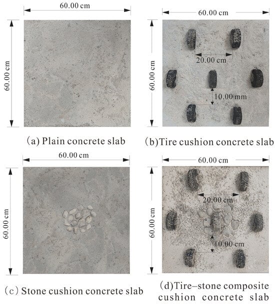 The specific experimental scheme was divided into four types: plain concrete slab, tire cushion concrete slab, stone cushion concrete slab, and tire–stone composite cushion concrete slab. For each experimental group, two specimens were prepared to minimize the influence of randomness on the test results. For the plain concrete slab, the mixed concrete was poured directly into the mold and compacted using vibration. For the tire cushion concrete slab and the tire–stone composite cushion concrete slab, half of the tires and stones were embedded, followed by the application of a plastic film to prevent water loss and avoid surface cracking of the concrete pavement specimen. Due to the thinness of the concrete slab, which precluded mechanical vibration compaction, manual compaction was achieved through striking. After casting the test specimens, they were regularly watered for maintenance, and after seven days, they were removed from the mold by tapping the four corners with a rubber hammer to prevent damage to the concrete pavement specimen surface due to insufficient strength. Once the test specimens were removed, they were cleaned, wrapped in plastic, and regularly watered until they were removed from the testing conditions after 28 days. The dimensions of the concrete slab and the casting diagram of the test specimens are illustrated in Figure 4.