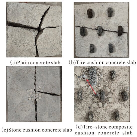 As shown in Figure 5, various experimental groups of concrete slabs exhibited different types of damage under rockfall impact. The plain concrete slab sustained damage from the rockfall impact, resulting in a crack pattern resembling an “X”. The stone cushion concrete slab also sustained damage, exhibiting a crack pattern resembling a “T”. The tire cushion concrete slab sustained damage, with a crack pattern resembling the transverse line. The overall damage pattern exhibited a horizontal crack extending along the central tire, with fewer longitudinal cracks extending from the center to the edge in the stone cushion concrete slab compared to the tire–stone composite cushion concrete slab. The tire–stone composite cushion concrete slab exhibited no obvious signs of damage, while some areas of the stone cushion sustained damage from rockfalls. It is evident that the damage patterns on the impact surfaces of the plain concrete slab, stone cushion concrete slab, and tire cushion concrete slab are similar, originating from the center point in radial cracks, with only the number of cracks varying. The concrete slab protected by the stone cushion has fewer cracks than the plain concrete slab, while the concrete slab protected by the tire cushion exhibits fewer cracks than the stone cushion concrete slab, and the slab protected by the tire–stone composite cushion shows almost no damage. Based on the observations from the impact test, it can be concluded that the protective effect of the toughness structure on concrete follows the order: tire–stone composite cushion concrete slab > tire cushion concrete slab > stone cushion concrete slab > plain concrete slab.