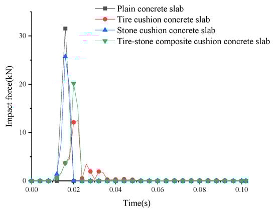 As shown in the curve of rockfall impact force with time in Figure 6, the impact force quickly reaches its peak value when the rockfall contacts the surface of the concrete slab. Upon the transmission of the impact force to the concrete slab, the force rapidly decreases. Furthermore, the analysis of the figure indicates that the peak impact forces of the stone cushion concrete slab, tire cushion concrete slab, and tire–stone composite cushion concrete slab are all smaller than plain concrete slab. Specifically, the peak impact force of the plain concrete slab decreases from 31.56 kN to 25.72 kN, representing a reduction of approximately 18.50%. In comparison, the tire cushion concrete slab exhibited a decrease from 31.56 kN to 12.49 kN, a reduction of approximately 60.42%. Similarly, the tire–stone composite cushion concrete slab showed a decrease from 31.56 kN to 20.15 kN, representing a reduction of approximately 36.15%. The duration of the initial impact starts with the rockfall contacts the slab and ends with the rockfall rebounds off the concrete slab. According to the figure, under the impact of rockfall at the same height and weight, the impact durations of the tire cushion concrete slab and the tire–stone composite cushion concrete slab are notably longer than the plain concrete slab. The rockfall impact forces of the plain concrete slab and stone cushion concrete slab are not hindered by impact, allowing the kinetic energy of the rockfall to be directly transferred to the concrete slab. In contrast, the kinetic energy of the rockfall decreases gradually when it hits the cushioned slabs. The tire cushion and tire–stone composite cushion slow down the impact due to the tire and stone acting as obstacles to the rockfall’s motion. Subsequently, the tire cushion concrete slab impacts the concrete slab and remains on it, absorbing a portion of the rockfall’s kinetic energy through the tire buffer. In contrast, the concrete slab with the tire–stone composite cushion impacts the stone cushion after the tire compresses, absorbing part of the kinetic energy, resulting in a rapid decrease in impact force. However, in comparison to the tire cushion, the stone cushion enhances the overall stiffness of the cushion.