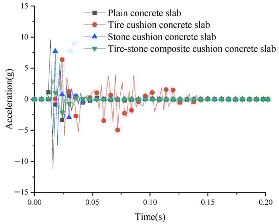 When the rockfall impacted the concrete slab, the resulting stress causes the slab bottom to vibrate. As shown in Figure 7, the peak acceleration of the vibration at the center of the plain concrete slab bottom is 11.23 g. As the distance from the center of the top slab increases, the acceleration values gradually decrease, reflecting the trend of the stress wave generated by the rockfall’s impact on the concrete slab, which spread out and gradually dissipates at the slab bottom. Significant acceleration occurs on the slab bottom due to tires’ high rebound characteristics and generates a peak vibration acceleration of 6.37 g. The tires on the stone cushion generate lower vibration acceleration than the plain concrete slab but higher than the tire cushion concrete slab, with a peak acceleration of 7.71 g due to the stiffness of the surface stones. The tire–stone composite cushion concrete slab exhibits the smallest vibration acceleration at all measurement points, with a peak acceleration of 3.39 g.