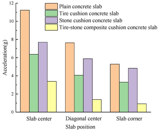 As shown in Figure 8, the peak acceleration of vibration at the center of concrete slab bottom under rockfall impact is as follows: plain concrete slab > stone cushion concrete slab > tire cushion concrete slab > tire–stone composite cushion concrete slab. The reduction in peak acceleration at the concrete slab bottom effectively evaluated that the tire cushion, stone cushion, and tire–stone composite cushion all exhibit good shock absorption effects. By comparing vibration accelerations at different positions of the slab bottom, the best shock absorption is revealed. The tire–stone composite cushion performs the best in reducing the impact of rockfalls on the concrete slab.