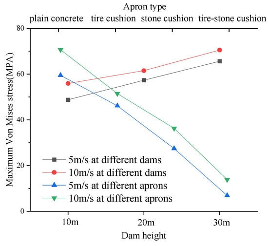 In general, the larger the stress value, the more likely the material is to crack [25]. Figure 10 shows the maximum Von Mises stress of the apron under different impact heights, speeds, and apron types. It can be observed that as the impact height and speed increase, the maximum Von Mises stress of the apron rises, occurring at the 3 m sized block impact location. Additionally, as the impact speed increases, the maximum Von Mises stress hierarchy follows: plain concrete apron > stone cushion apron > tire cushion apron > tire–stone composite cushion apron.