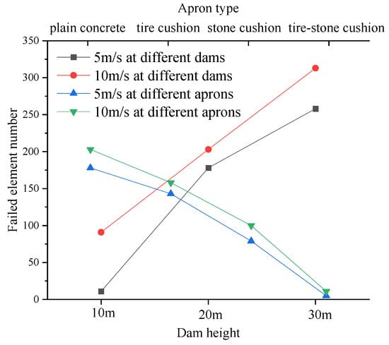 By setting the failure criterion of concrete elements in the K file, the damage to concrete under impact can be more accurately reproduced. In this study, a maximum principal strain of 0.05 is adopted as the failure criterion. Figure 11 shows the statistical number of failed concrete elements under different impact heights and speeds, as well as varying types of toughness aprons. It can be observed from the figure that as the impact height and speed increase, the number of failed concrete elements correspondingly increases. Furthermore, as the impact speed increases, the hierarchy of failed concrete elements is as follows: plain concrete apron > stone apron > tire apron > stone–tire composite apron. The stone–tire composite apron structure exhibits minimal damage.