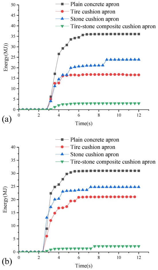 To investigate the impact resistance performance of various types of toughness apron structures, we extracted the curves of internal energy with time for different types of toughness apron structures at debris flow velocities of 5 m/s and 10 m/s, each under an impact height of 20 m. As shown in Figure 13, the initial internal energy of the apron is 0. At approximately t = 2 s, the debris flow boulders begin to impact the toughness aprons structures. Some of the kinetic energy from the boulders is transferred to the apron via the stone cushion as rigid damping, converting into the internal energy of the apron. Some is converted into elastic potential energy and the internal energy of the tires after impacting them through elastic damping. Some is rebounded by the apron, converting into the gravitational potential energy of the boulders. Some is consumed and converted into heat energy through friction with the apron. Subsequently, it falls again for energy conversion and ultimately either remains on or leaves the apron. At t = 8 s, the internal energy of the apron reaches its peak value and stabilizes. By comparing the internal energy of various toughness apron structures at the same impact height and velocity, we observe that the internal energy follows the order: plain concrete apron > stone cushion apron > tire cushion apron > tire–stone composite cushion apron, with the internal energy of the tire–stone composite cushion apron being significantly smaller than the other aprons.