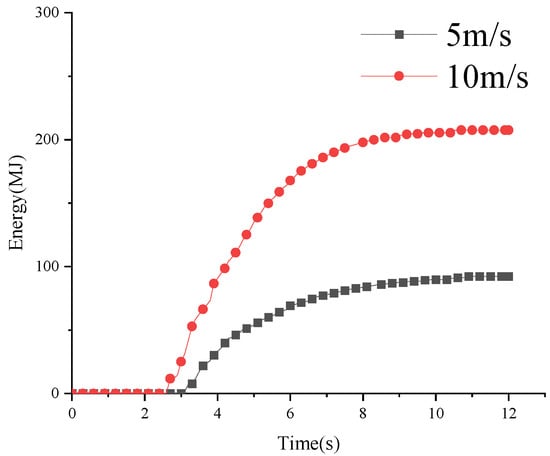 Notably, according to the energy curve with time of the apron in Figure 13, at the same height, the kinetic energy of debris flows with higher initial velocities is expected to be greater; however, aprons made of plain concrete absorb less internal energy due to differences in the debris flow impact angle. Figure 14 presents the sliding energy curve with the time of the plain concrete apron at height of 20 m, impacted by debris flows with velocities of 5 m/s and 10 m/s. The debris flow with a higher initial velocity impacts the apron at a smaller angle, resulting in horizontal frictional sliding energy from the 10 m/s debris flow being approximately twice that of the 5 m/s debris flow.