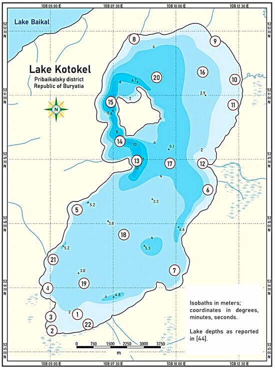 Field studies were carried out from 2015 to 2024 to analyze the hydrochemical parameters of Lake Kotokel. Water samples were collected at locations identified based on bathymetric survey data (covering sites with varying depths) and areas near potential pollution sources, such as settlements and tourist facilities. The sampling points, indicated on the bathymetric map [43], are presented in Figure 2. Samples were collected four times annually, corresponding to different seasons: during the ice-covered period (late February to early March), spring (May), summer (July), and autumn (late September to early October). Between July 2015 and 2021, water sampling was limited to points 2 and 8. In 2022–2023, additional samples were collected at points 10, 15, 16, and 19. By 2024, sampling had expanded to all points indicated on the map, encompassing 22 stations.