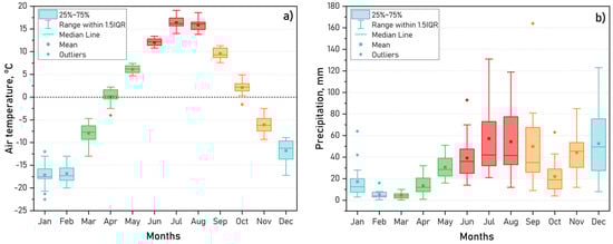 Air temperature (a) and precipitation (b) according to the meteorological station of Goryachinsk settlement (2008–2024).