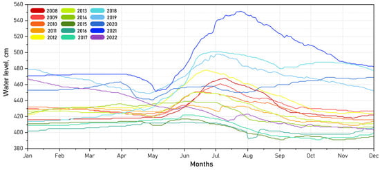 This distinct unimodal water level pattern was disrupted in 2003 [17] and during 2015–2016, years characterized by severe droughts and wildfires in the region, when minimum levels were recorded in July–August instead of the usual peak. Atypical dynamics were also observed in 2020 and 2022, the years preceding and following 2021, when an extreme water level rise was documented. During these years, the maximum water levels were recorded in December and January.