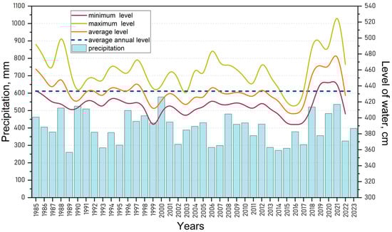 Long-term fluctuations in water levels in Lake Kotokel in 1985–2022 (hydrological station in Istok, zero mark: 453.96 m, Baltic height system) and precipitation levels (meteorological station in Goryachinsk).
