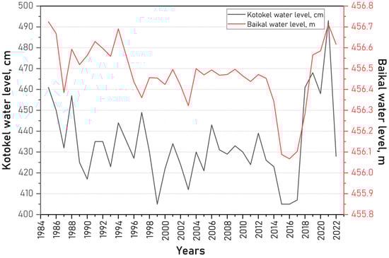 Seasonal fluctuations in Lake Kotokel’s water level from 2008 to 2022 generally ranged between 30 and 50 cm, exceeding the 1 m mark only once during this period in 2021 (101 cm).