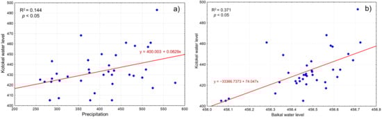 An analysis of long-term data on the water levels of Lakes Kotokel and Baikal, as well as regional humidity trends (Figure 6), revealed a stronger correlation between the water levels of Kotokel and Baikal (0.61, p < 0.05) than between Kotokel water levels and precipitation (0.38, p < 0.05) (Figure 7).