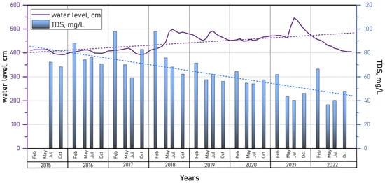 Seasonal and long-term dynamics of water mineralization in Lake Kotokel from 2015 to 2022 (dashed lines indicate the trend lines of the corresponding parameters).