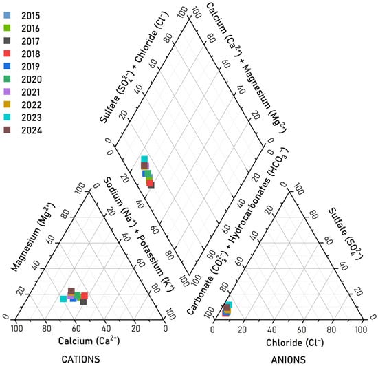 Relative (%-equiv.) concentration of major anions and cations in Lake Kotokel water in 2015–2024 on a tri-linear Piper diagram.