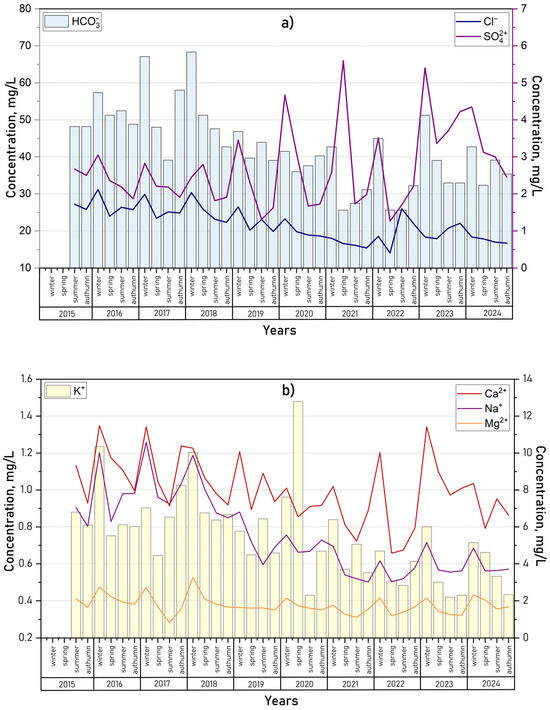 The ionic composition of the lake water remained stable across both the seasonal and long-term scales and was relatively uniform throughout the lake area. Seasonal variations in anion and cation concentrations from 2015 to 2024, shown in Figure 10, aligned with the trends in mineralization for all ions except sulfates. The observed increase in sulfate concentrations over time may reflect their accumulation due to anthropogenic influences, a pattern previously documented in other aquatic systems within the Baikal Natural Territory, such as Lake Gusinoe [14], and the Selenga [70] and Barguzin [71] Rivers.