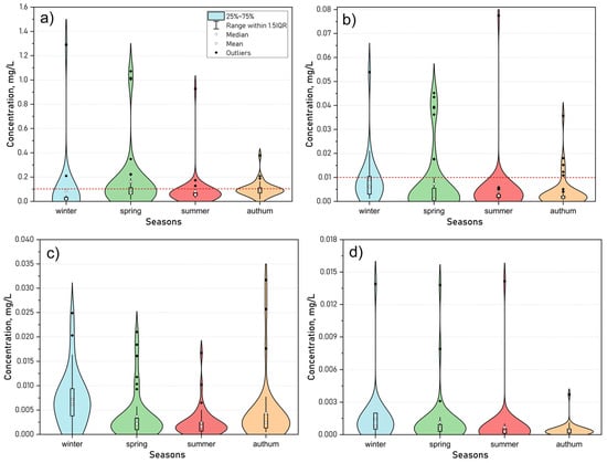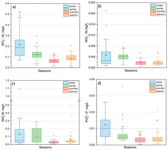 Seasonal dynamics of mineral forms of nitrogen (NO3−, NO2−, NH4+) (a–c) and phosphorus (PO43−) (d) in 2015–2024.