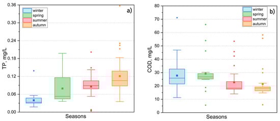Temperature, turbidity, pH value, dissolved oxygen (DO), total dissolved solids (TDS), and the content of hydrogencarbonates, phosphates, ammonium, nitrites, nitrates, as well as chemical oxygen demand (COD) level in water, were measured in a field laboratory using additional equipment (pH tester, Hanna portable instruments (HI 991300, HI 98703, Hanna instruments, Judetul Salaj, Romania), photoelectric colorimeter (PE-5400 UV, Ecroskhim, Saint-Petersburg, Russia) on the day of sampling.