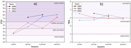To assess the trophic status of the lake, two eutrophication indices were utilized, i.e., Carlson’s Trophic State Index (CTSI) and the Trophic Index (TRIX), both of which are widely recognized in scientific research [56,57,58,59,60]. The methodologies for calculating these indices are outlined in the Annex, with the trophic status ranking scale presented in Table S3.