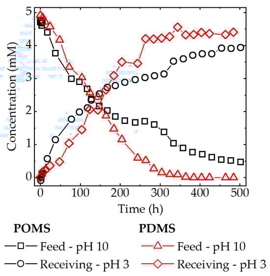 The transport of aniline from feed (pH 10) to the receiving solution (pH 3) through hydrophobic POMS and PDMS membranes (experimental conditions a and b) is shown in Figure 1. At these pH levels, 99.9% of aniline is expected in its neutral form in the feed. In comparison, 98% of aniline is expected in its positively charged form in the receiving solution. When using the POMS membrane, the concentration of aniline in the feed dropped from 4.7 to 0.5 mM after 500 h, achieving a 90% removal. Correspondingly, the concentration of aniline in the receiving solution increased from 0 mM to 3.9 mM. The mass balance showed a 6% mass loss at the end of the experiment, indicating the adsorption of aniline in the POMS membrane. The observed aniline adsorption would be induced by hydrophobic interactions with the POMS membrane. The concentration profile of aniline in PDMS was similar to that in POMS. However, the removal of aniline reached 100% at 384 h, thus showing a faster aniline transport through the PDMS membrane, while a 10% mass loss was observed at the end of the experiment. The initial fluxes of aniline from the feed (i.e., calculated from the initial linear regime) were 38.9 and 30.8 mmol·m2·h−1 for the POMS and PDMS, respectively, thus showing similar values.