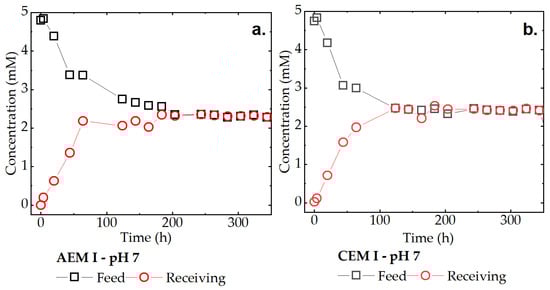 The impact of pH on the diffusion of aniline through AEM type I and CEM type I membranes was investigated. The feed and receiving compartments were adjusted to pH 7 to maintain aniline in its neutral form and thus create conditions where diffusion of aniline will be driven only by the concentration gradient (experimental conditions c and d). At pH 7, aniline is mainly present in its neutral form (99.6%). Therefore, no transport would be observed after an equilibrium concentration in the feed and receiving compartment is reached due to a lack of a driving force.