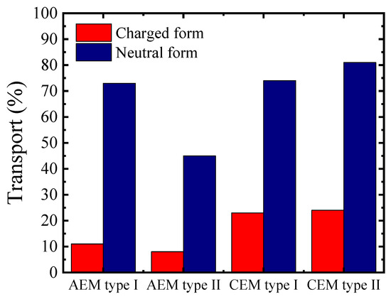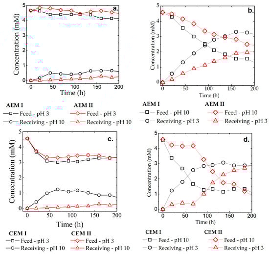 The main characteristic of ion-exchange membranes is their preferential permeability to counter-ions. However, co-ions can also be transported through the membrane due to a difference in the chemical potential of the solution and membrane []. The transport of neutral aniline in IEMs of different characteristics as a function of pH has received little attention and, hence, needs further investigation. Based on the different properties of the membranes (Table A1), the current experiments compared the transport of neutral and positively charged aniline ions using AEM type I, CEM type I, AEM type II, and CEM type II (experimental conditions e to l) (Table 1).