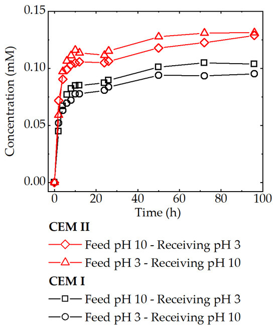 The transport of charged aniline from the feed (pH 3) through AEM type I and II toward the receiving solution (pH 10, where the aniline is expected to turn neutral) was studied (Figure 3a). AEM types I and II allowed the transport of the co-ion (positively charged) aniline despite electrostatic repulsion forces. However, the transport kinetics was slow in both AEMs, resulting in initial fluxes of 3.4 and 2.4 mmol·m2·h−1 for AEM type I and II, respectively. For example, after 200 h, 89% and 96% of the aniline were retained in the feed compartment for AEM types I and II, respectively. These values are close to the permselectivity reported by the manufacturer (i.e., 92% and 95% for AEM types I and II, respectively). In addition, this trend is also consistent with that reported by the manufacturer (Table A1); specifically, AEM type II showed a higher permselectivity. As discussed in the previous section, IEMs show a permselectivity value below 100%, thus allowing the transport of co-ions (Figure 4) [].