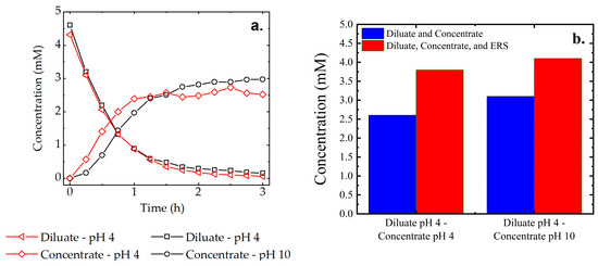 The influence of pH on the transport of charged aniline by ED was studied under pH 4 at the diluate compartment and under pH 4 and pH 10 at the concentrate compartment (experimental conditions m and n). The pH was adjusted in real-time during the experiment to maintain the desired experimental conditions. A constant electrical potential of 7.5 V was applied. Both experiments showed a similar removal profile: an initial fast decrease in the aniline concentration in the diluate compartment (i.e., resulting in similar initial fluxes of 124.7 and 135.4 mmol·m2·h−1 for pH 4 and 10 at the concentrate compartment, respectively, due to electromigration) and a slower increase in the aniline concentration in the concentrate compartment (Figure 6a). After 3 h of experiments, a similar aniline transport (97% and 96%) was recorded for experimental conditions m and n (i.e., pH 4 and 10 at the concentrate compartment), respectively. Therefore, the pH of the concentrate compartment did not significantly influence the removal efficiency of charged aniline in the diluate compartment by ED. Nevertheless, the decrease in the aniline concentration in the diluate compartment did not translate into a corresponding increase in the concentrate compartment. Approximately 30% of the aniline was not accounted for in the mass balance for both experiments. Therefore, the transport of aniline to the electrode solution was investigated. The concentration of aniline in the electrode solution was measured. The obtained results confirmed the presence of aniline in the electrode solution. The aniline concentration gradually increased with time during the experiment. The aniline in the ERS compartment was added to the mass balances (Figure 6b), after which aniline adsorption was detected in the system. Specifically, 13% and 11% aniline adsorption were recorded for experimental conditions m and n (i.e., pH 4 and pH 10 at the concentrate compartment), respectively. As evidenced in the previous results, the adsorption of aniline would have preferentially occurred in the CEM type I membranes.
