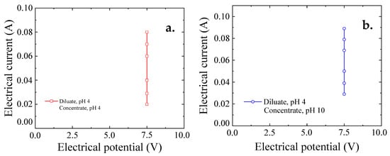 The current/voltage curve for (a) pH4 and (b) pH 10 conditions in the concentrate compartment.