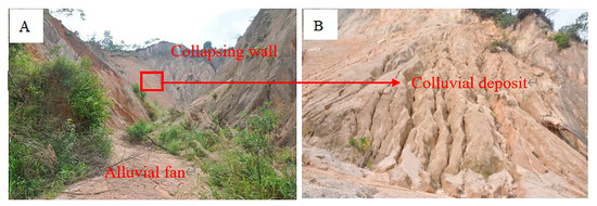 Photograph of Benggang landforms in the study area. (A) Different components of typical Benggang landforms; (B) loose colluvium with many distributed rills.